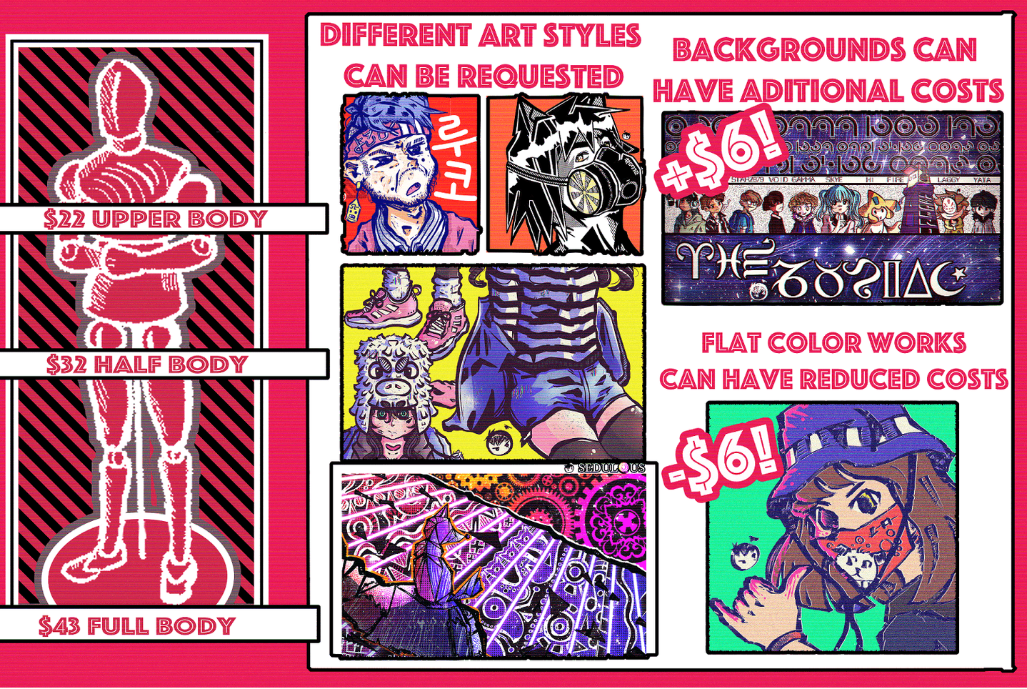 1. GENERAL TERMS•These terms aren’t 100% set in stone, terms, agreements or prices can change depending on the situation by discussing it.•All drawings will include a small watermark.•I have the right to reject any order that I wish not to illustrate.2. PAYMENT•Currency accepted is mainly USD (Other currencies can be accepted) & can be paid through PayPal.•Commissions will be paid 100% upfront once the first draft is approved & afterwards I will request payment through PayPal.3. PROCESS AND DELIVERY•While working on your commission I’ll remain in contact with you by sending Drafts that you must review for anything you’d like to change.•The time completion varies around 3 days - 2 weeks depending on the complexity of the piece, or other commissions that i'm working on simultaneously.4. COPYRIGHT / USAGE POLICYI reserve the full rights to the image and it's use/distribution unless otherwise agreed upon (rights to the image for your own non-personal use may be purchased at any time).The buyer is allowed to:•Use the commissioned piece for personal use like social media, self promotion, etc. as long as the artwork itself is not the main subject for the earnings.•Print the artwork and claim the character(s) as their own, but not the artwork itself.The following is considered copyright infringement:•Using the copyrighted artwork commercially.•Claiming the artwork as your own & or removing my signature from the artwork.5. REFUND / CANCELLATION POLICYIn the off chance the commission is canceled while it is undergoing, a fee will be charged depending on the status of its completion.(Do not request a Paypal chargeback. I will transfer the money back to you myself.) Thank you for your understanding